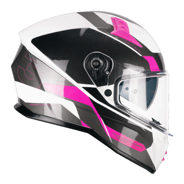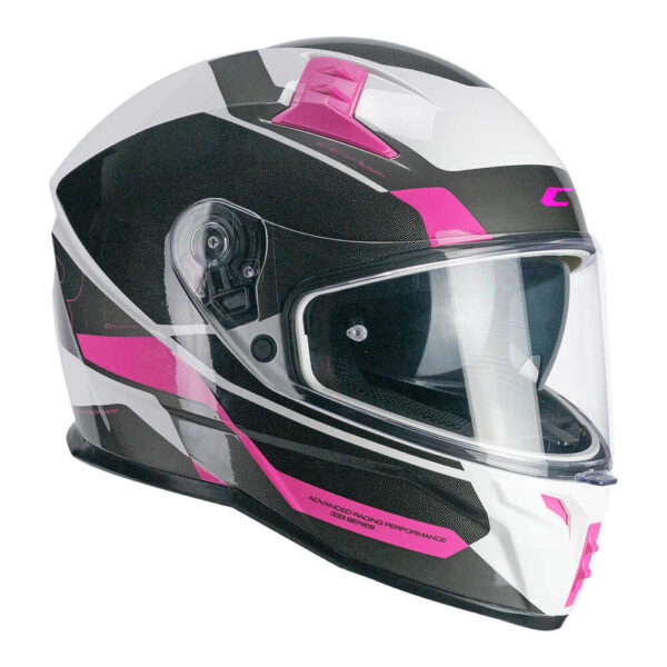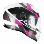 Casco CGM 333 ONYX SPORT Rosa. La 333 ONYX es el compañero de viaje perfecto para todos los motoristas. La calota HPT (High Performance Terpolymer), combinada con una excelente aerodinámica, garantiza estabilidad y confort incluso a las velocidades más altas. El sistema de ventilación Air Stream System asegura un frescor constante, mientras que la pantalla interior parasol retráctil se adapta a todas las condiciones de luz. Los interiores, fabricados con un innovador tejido hexagonal termoformado, ofrecen un confort sin precedentes, que se ve reforzado por el deflector nasal y el deflector de barbilla. Preparado para la instalación de Pinlock 70 y de sistemas de comunicación por intercomunicador, el 333 ONYX es la elección ideal para quienes buscan un casco versátil, seguro y de altas prestaciones.