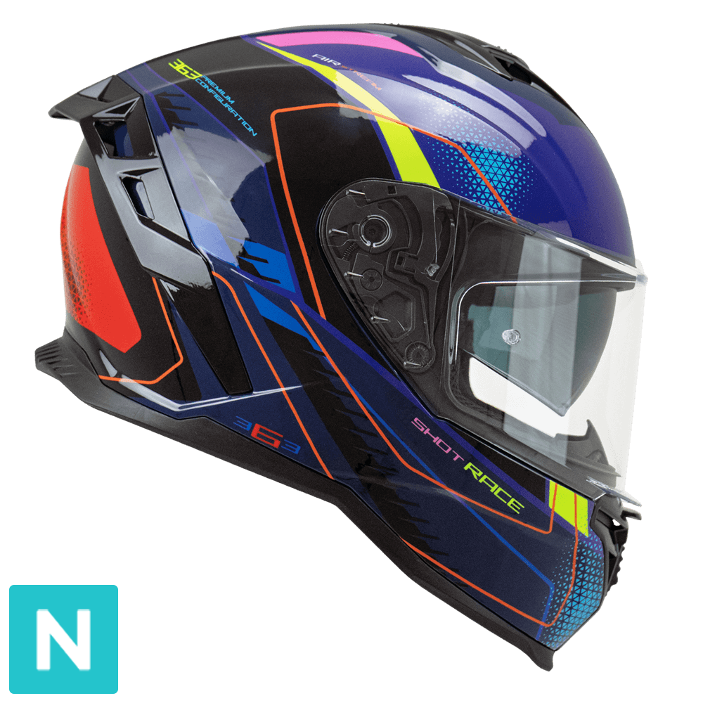 Realizado en dos tamaños de calota exterior, dispone de un sistema de termorregulación en el interior del casco, formado por tres zonas de conductos que garantizan un flujo de aire continuo. La pantalla exterior, preparada para Pinlock 70, es basculante para una perfecta adherencia a los dobles sellos perimetrales y junto con bloqueo en posición cerrada aseguran el silencio y el confort de conducción. El 363 también está equipado con una pantalla parasol retráctil interna. El compartimento interno está compuesto por una parte superior hexagonal termoformada, tejidos ExtraCool, bandas de alta visibilidad, deflector nasal y mentonera y SOS RELEASE SYSTEM que permite una rápida liberación de las almohadillas laterales en caso de emergencia.