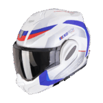 Casco SCORPION EXO TECH EVO PRO ACUTI Blanco Azul Rojo. Casco modular estilo flip-back con un perfecto diseño integral, pantalla de amplia visión con Pinlock, calota pequeña y peso ligero, mentonera con mecanismo de fácil manejo y ventilación superior onetouch.