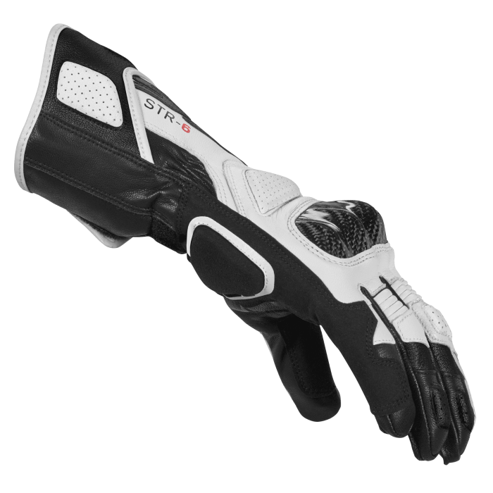 Guantes SPIDI STR-6 Negro Blanco. SPIDI Str-6 ofrecen el equilibrio perfecto entre el exigente rendimiento de circuito y la comodidad. Los nudillos de fibra de carbono con refuerzo interior de doble densidad garantizan altos niveles de absorción de impactos y resistencia a la abrasión, mientras que las inserciones de cuero multicapa en la palma y el dorso están estratégicamente ubicadas en las áreas más cruciales. El cierre de doble velcro brinda a los motoristas un amplio rango de ajuste. Los guantes Str-6 cuentan con la certificación EN13594:2015 KP.